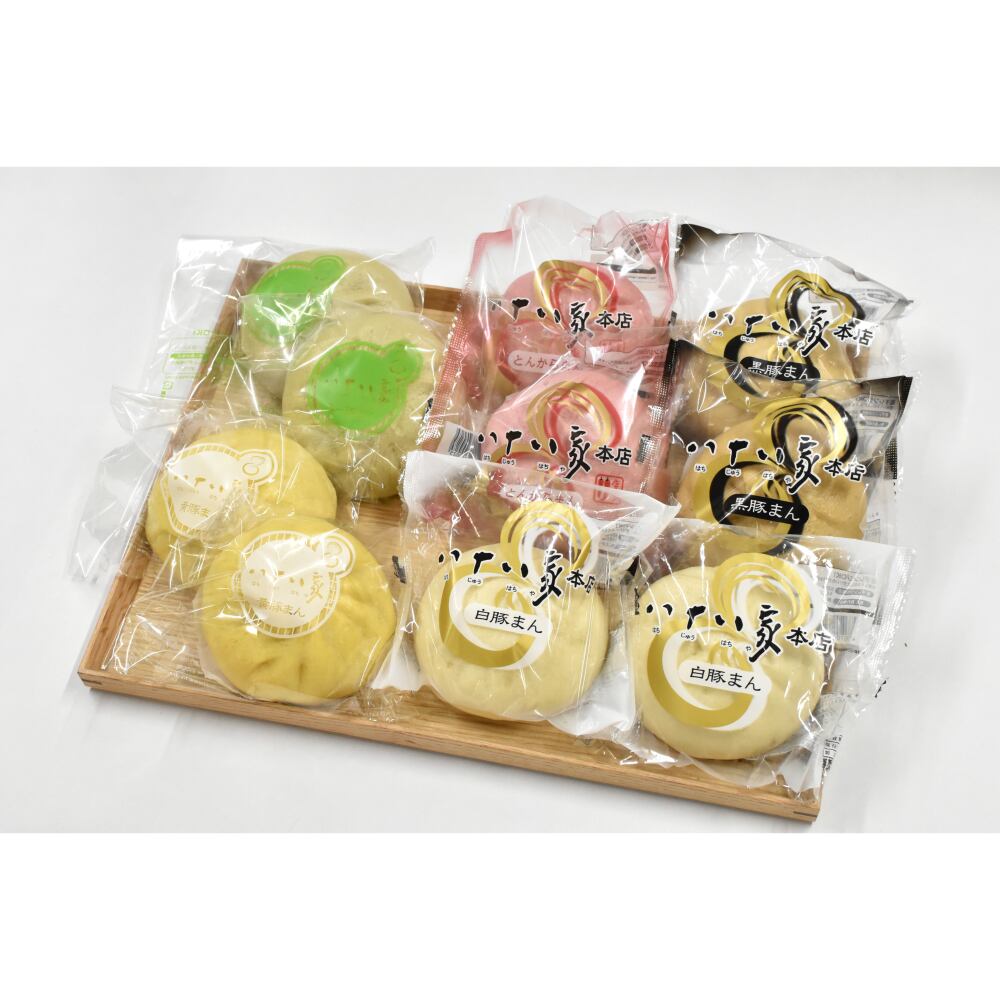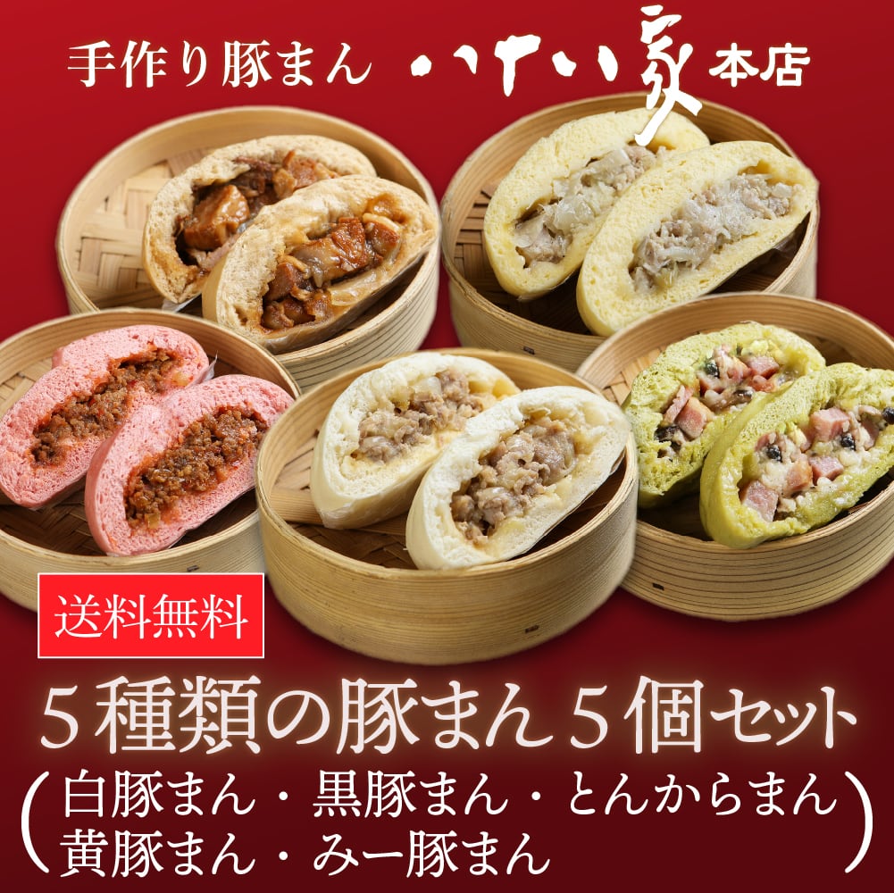 内容量:白豚まん、黒豚まん、とんからまん、黄豚まん、みー豚まん各1個(計5個)